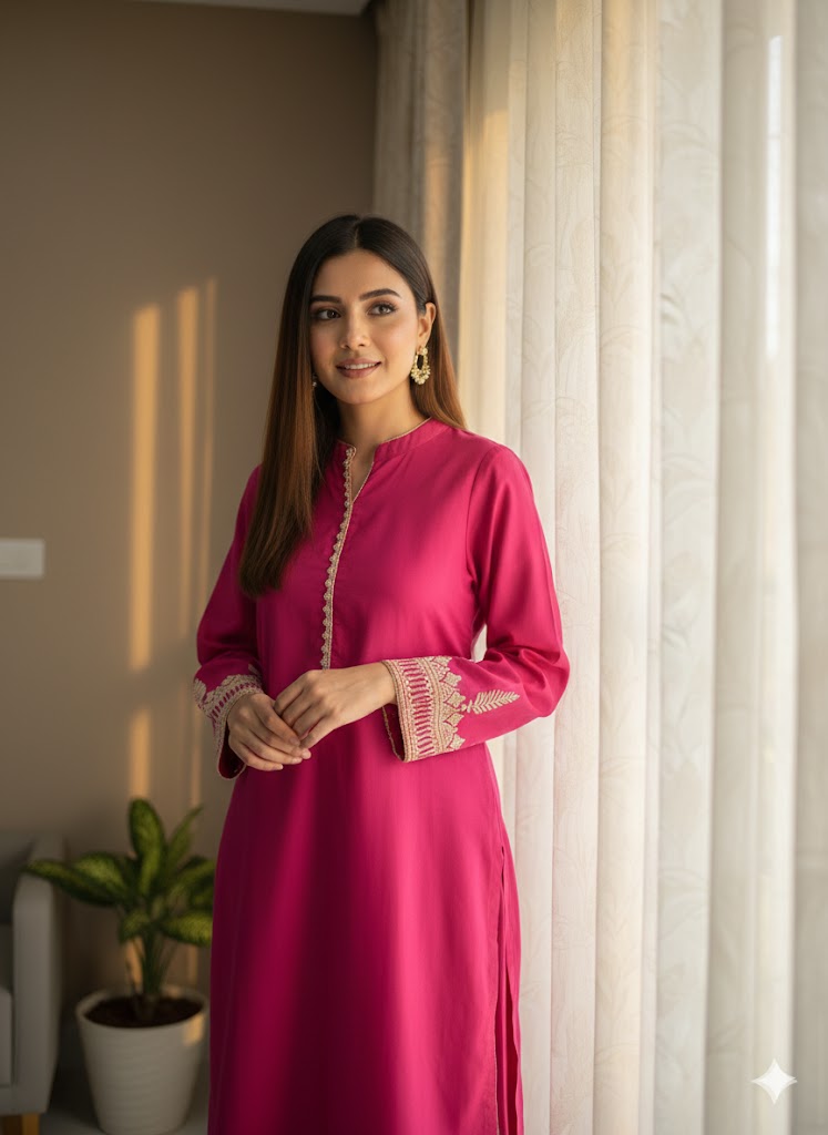 Turn heads with our Magenta Embroidered Two-Piece, crafted in soft, breathable fabric for all-day comfort. The kurta features delicate embroidery along the neckline and sleeves, showcasing intricate leaf and geometric motifs in contrasting tones. Paired with matching trousers adorned with detailed embroidery at the hem, this outfit strikes the perfect balance between bold color and elegant craftsmanship. Ideal for casual gatherings or semi-formal occasions, it brings a refreshing touch of vibrance to your wardrobe.